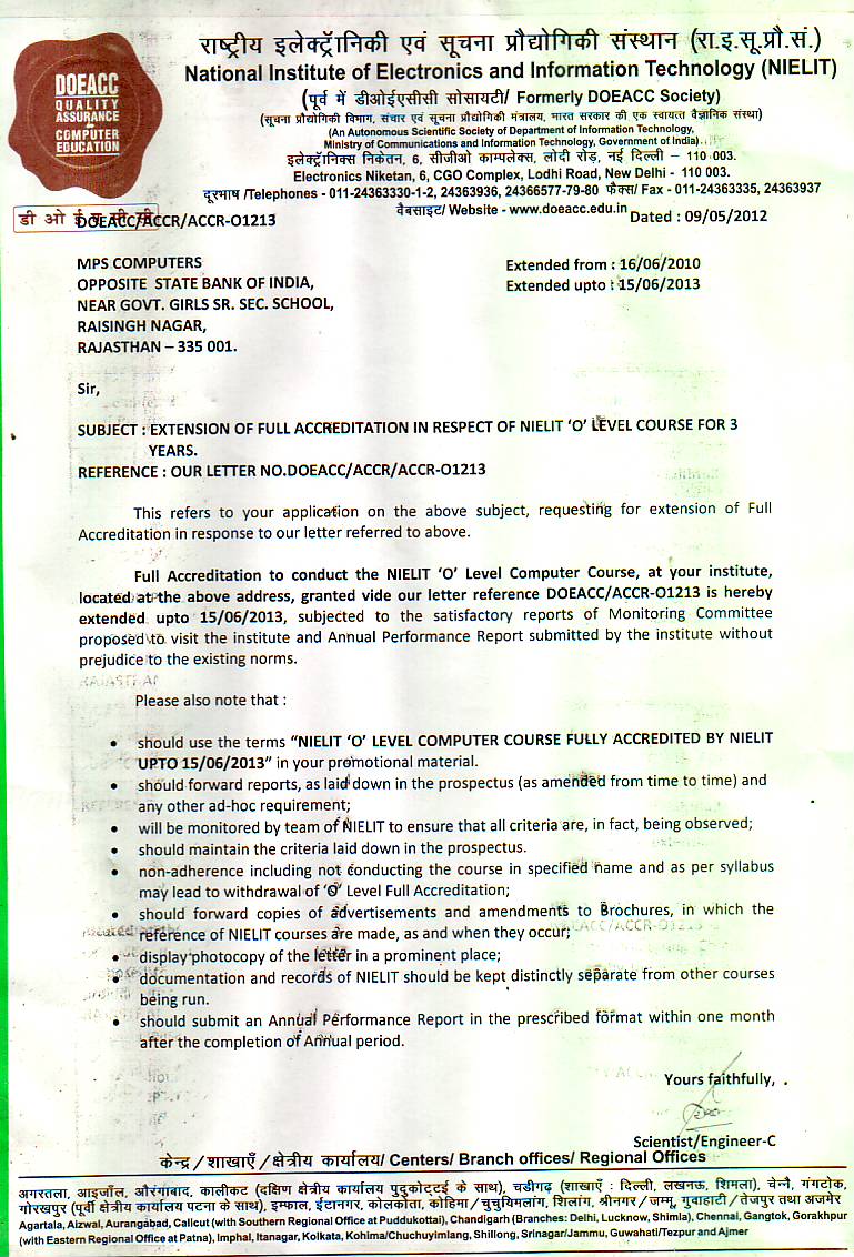DOEACC Is Now Known as NIELIT It is an Autonomous Body Of Govt. Of India